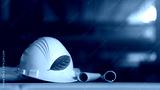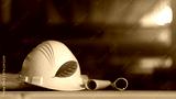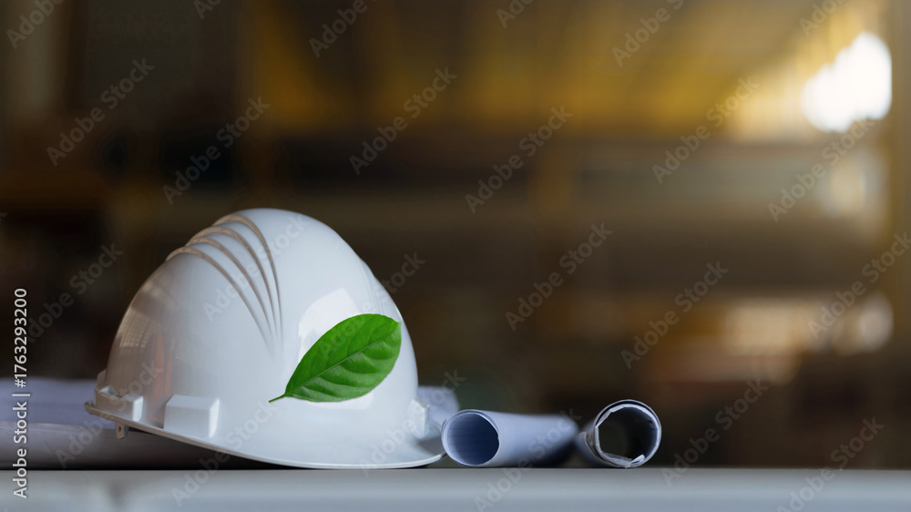 A White safety helmet with green leaf and blueprints on the table represents sustainable construction, clean energy innovation, and ESG concept promoting eco-friendly engineering and green industry.