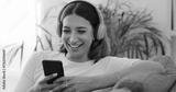Phone, relax and happy woman with headphones in home, streaming service or music on internet. Mobile, audio and person in living room for playlist search, online sound and listening to podcast