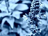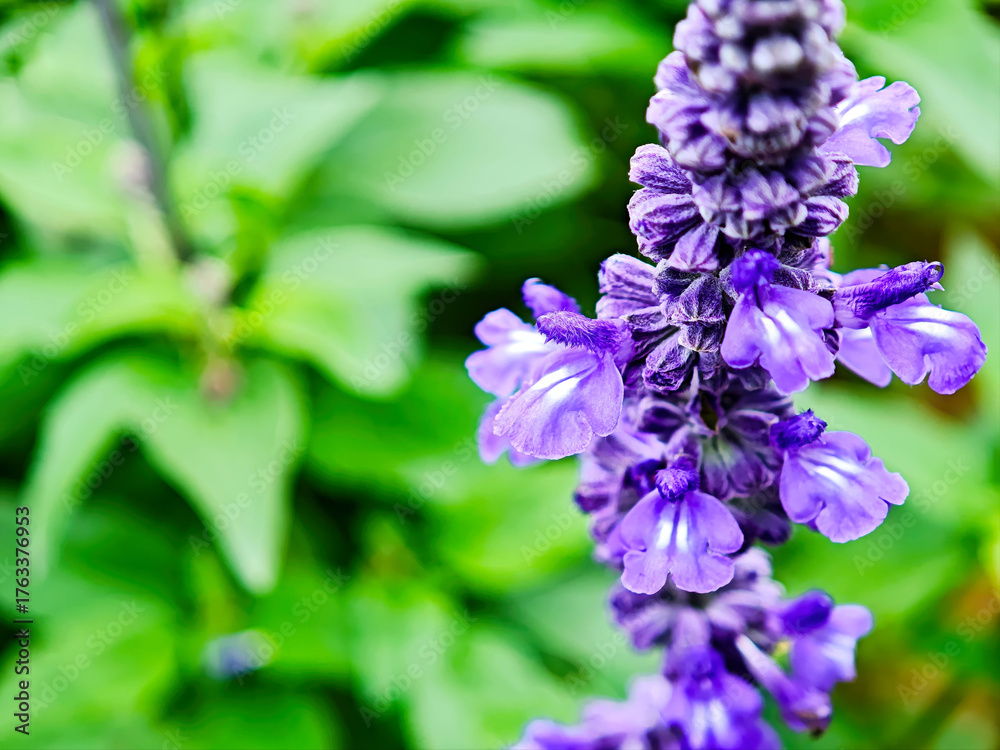 Purple flower spike with green leaves background in bright natural light