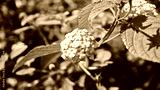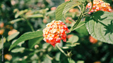Lantana flower cluster with green leaves in natural sunlight, showing vibrant colors and texture