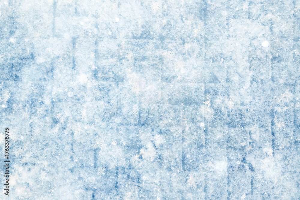 Winter texture of paving slabs covered with snow, top view, background surface in snow