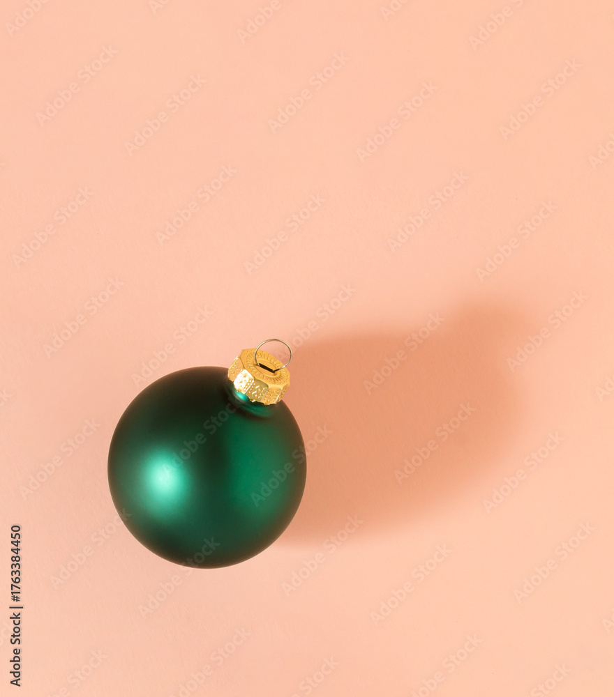Christmas deep green ball on a pink background. Creative xmas composition for festive, elegant holiday themes.