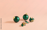 Christmas baubles, two deep green balls and one broken into pieces. Creative xmas composition for festive, elegant holiday themes.