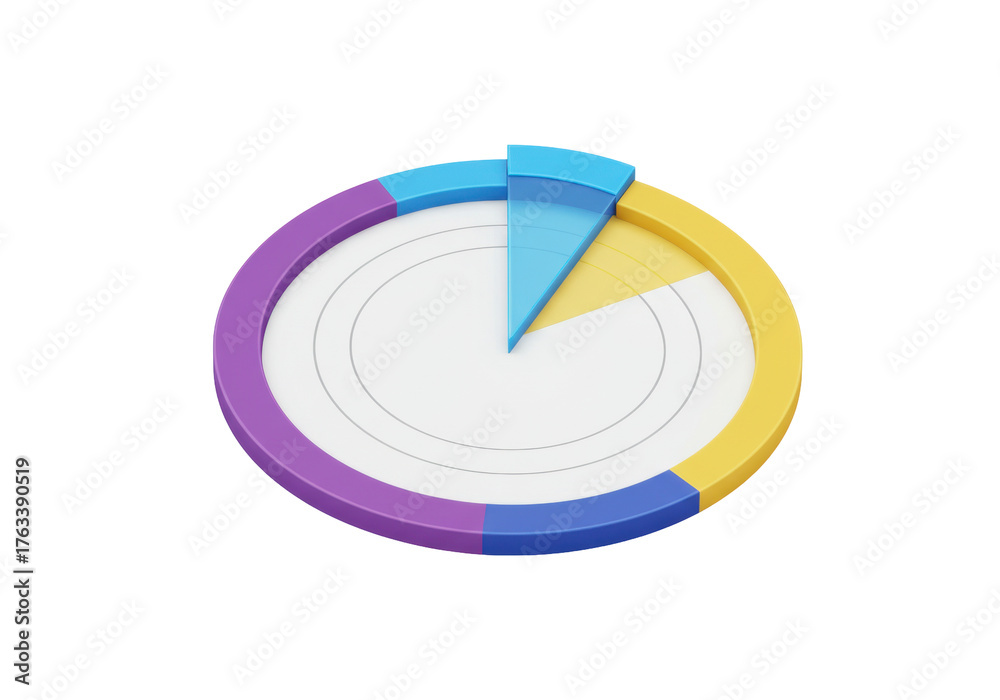 Isolated 3D pie chart with colored segments and an internal disk for data analytics reports