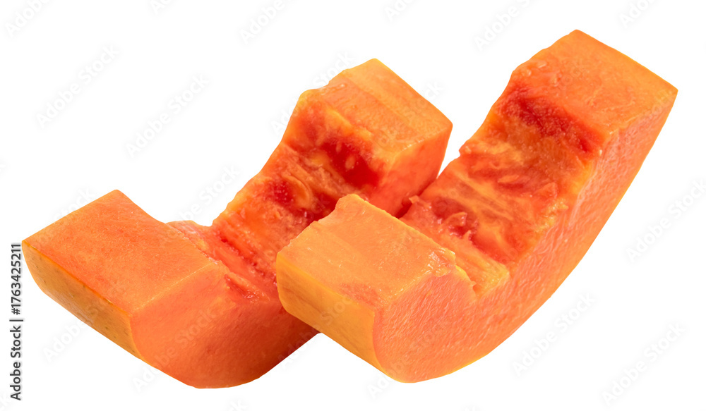 Fresh, ripe papaya chunks, vibrant orange in color, arranged on a pristine. Perfect for healthy eating, tropical fruit, and wholesome diet concepts. Isolated for easy use.