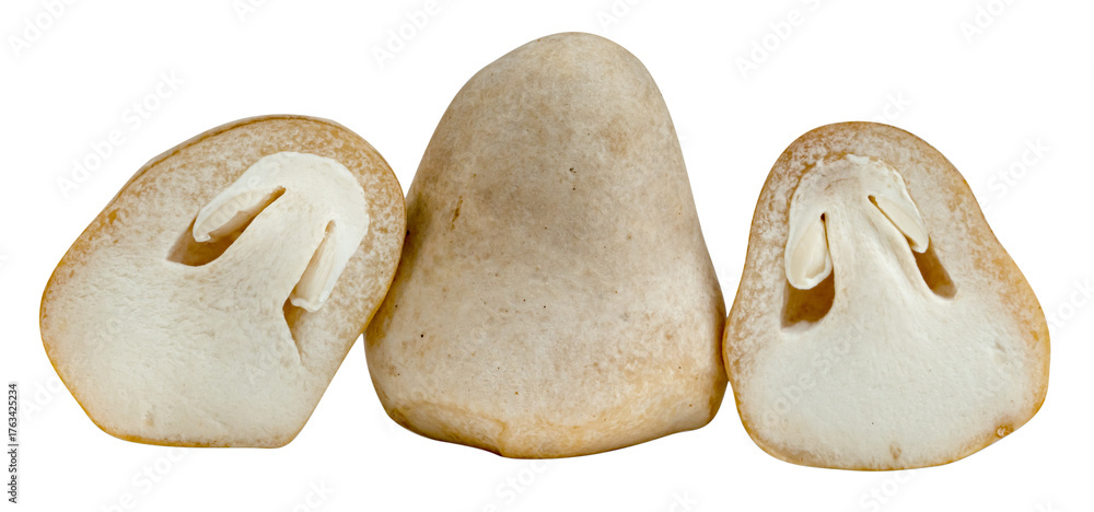 Fresh straw mushrooms (Volvariella volvacea) isolated. One whole mushroom is centered, flanked by two halves showing detailed internal gills and fleshy texture. Edible fungi.