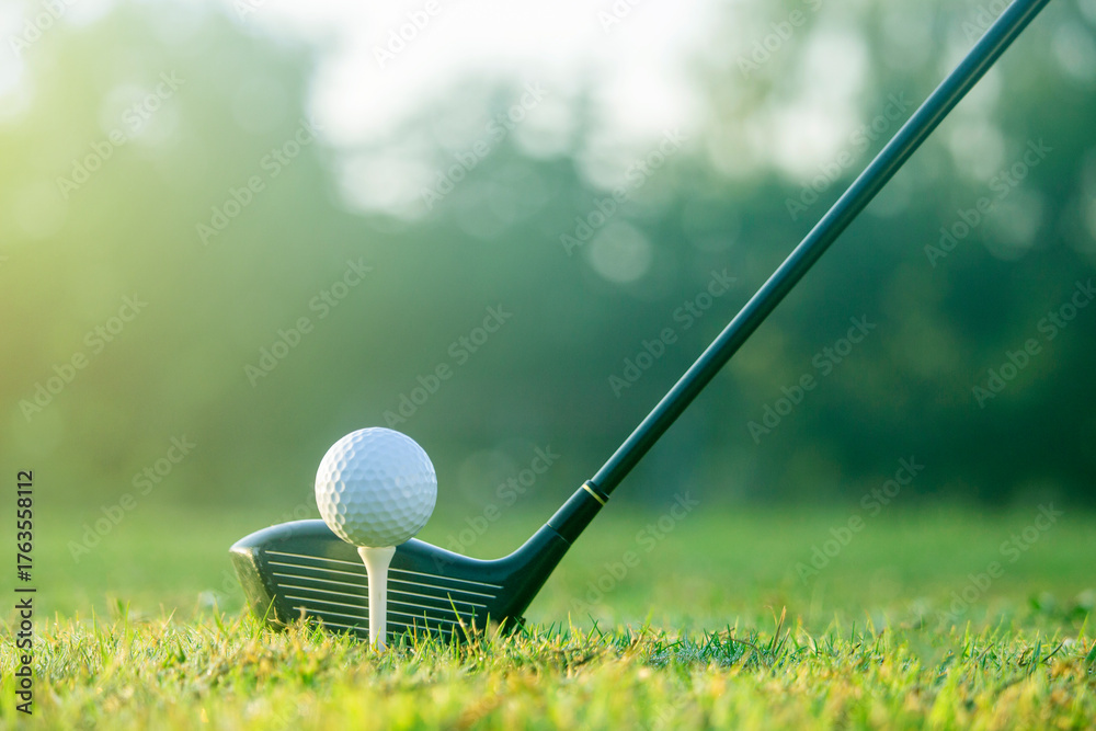 Golf clubs and golf balls on a green lawn in a beautiful golf course