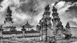 Scenic view of Pura Ulun Danu Beratan Bedugul temple surrounded by lake and misty highlands in Bali