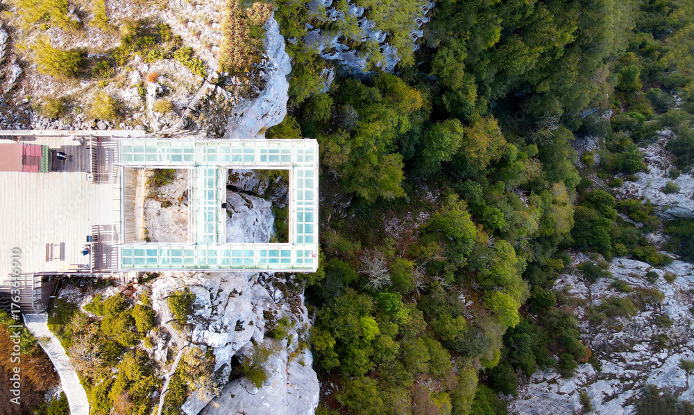 The scenic aerial view of Çatak Kanyonu, with people enjoying the autumn season on the glass sightseeing terrace at 450 m height, with an amazing panorama, Kastamonu, Turkey