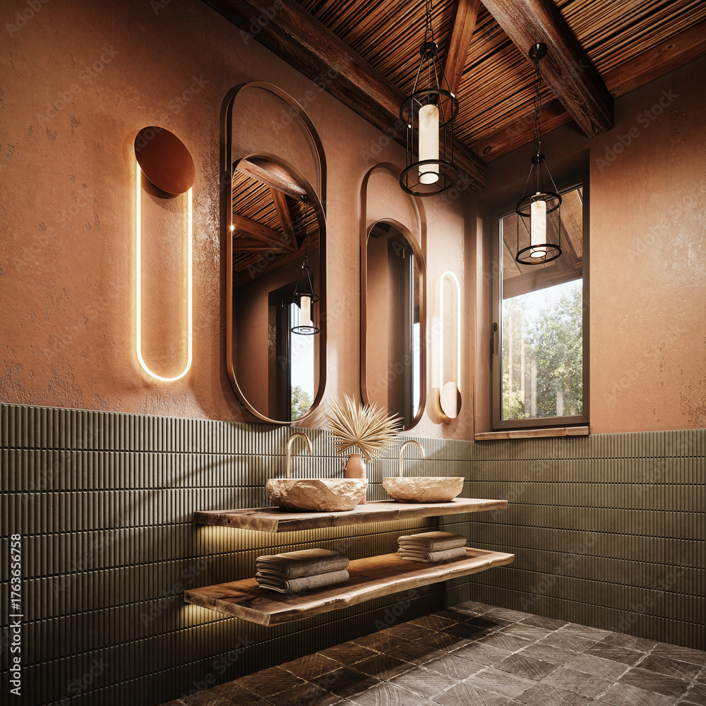 Contemporary bathroom interior design with green tiles and terracotta walls. Modern bathroom. 3D Rendering, 3D Illustration