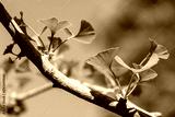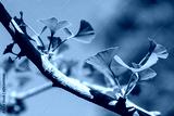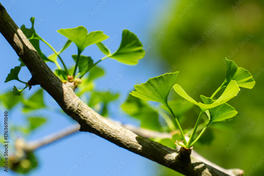 Bright green Ginkgo tree (Ginkgo biloba) leaves sprout from branch against clear blue sky, showcasing early growth and vibrant life. The leaves are distinctively fan-shaped. Nature concept for design
