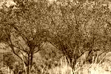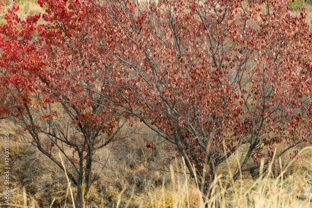 Tree with red leaves stands amid dried grass in autumn landscape. Seasonal change, natural environment and ecosystem dynamics.