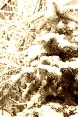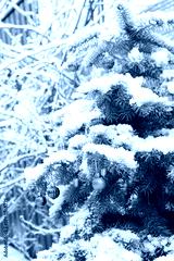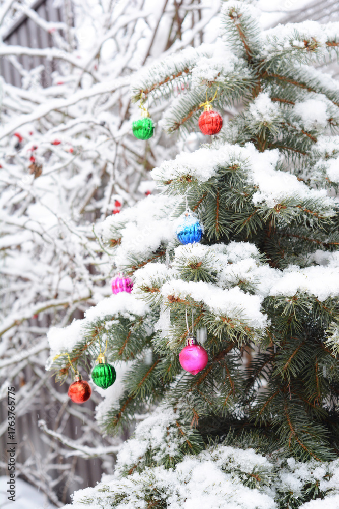 Blue spruce Christmas tree covered in snow and decorated with colorful Christmas balls in the garden