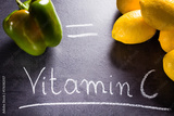 Green pepper and group of lemons with equal sign and word vitamin C written by white chalk on black slate.