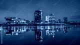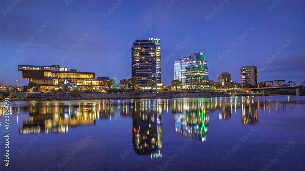 Wide angle nightscape, cityscape of Saskatoon River Landing area with beautiful water reflections.
