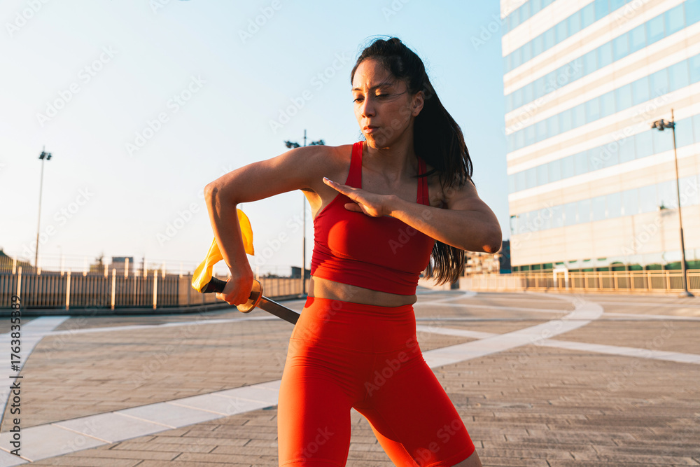 Chinese young woman practicing wushu kung fu.