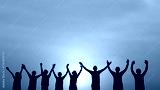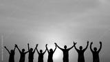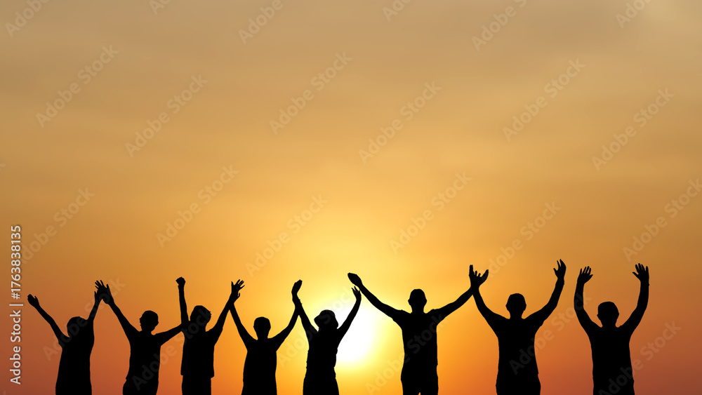 A silhouetted group of people raising their arms towards a warm, orange sunset, symbolizing hope, freedom, and unity.