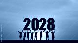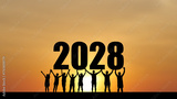 Silhouette of a group of people holding up the year 2028 against a stunning sunset sky. They represent a community working together