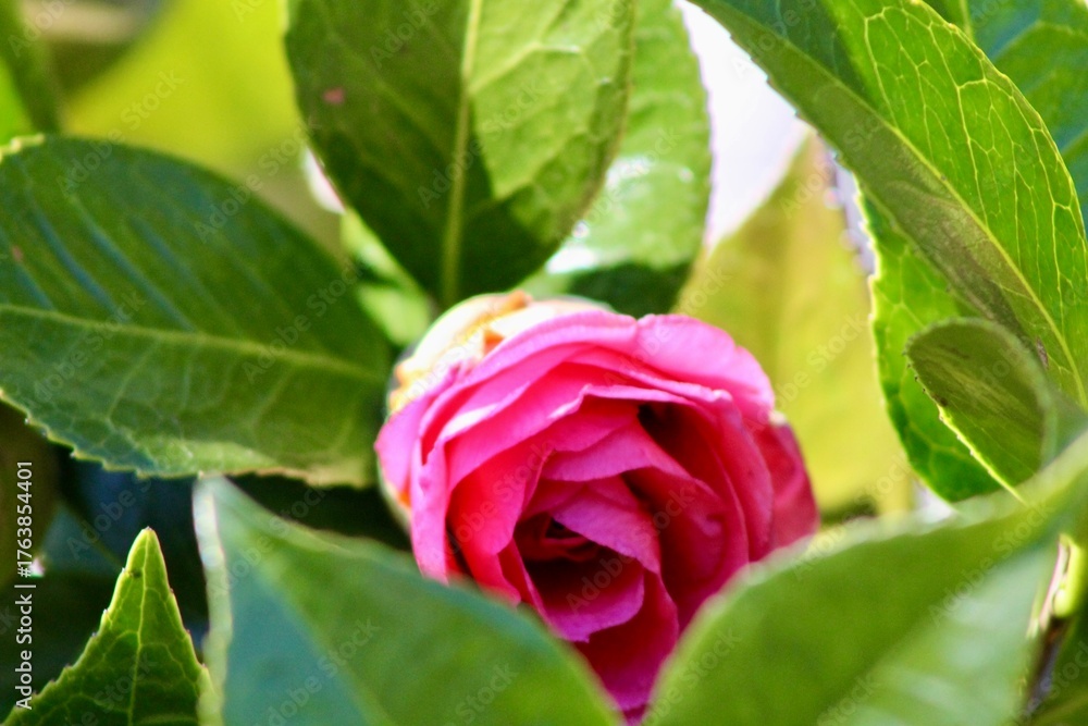 A vibrant pink Camellia flower bud peeks out from between thick, glossy green leaves. A close-up capturing the freshness and potential of new growth in the spring garden.
