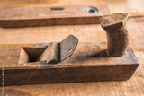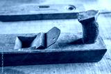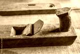 Antique construction tools, such as an old wooden level, a wooden plane, pliers, and a plumb line, are isolated and display an antique charm on a brown wooden wall.