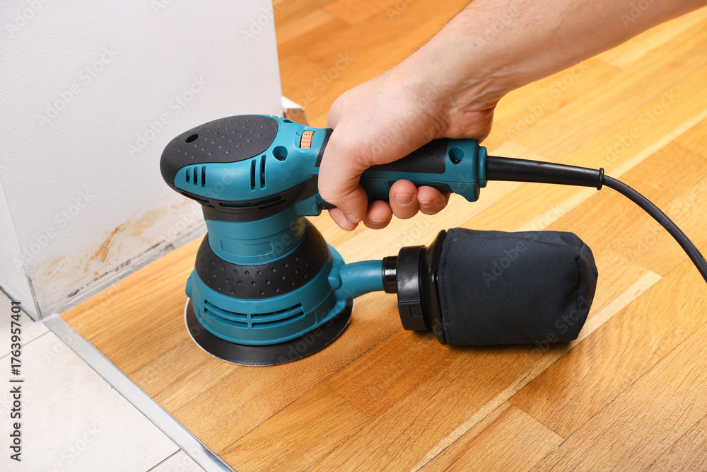 Sanding a wooden floor using an electric sander in a bright room.