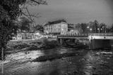 Graniczna rzeka Olza w Cieszynie z mostem łączący polski i czeski Cieszyn. Panorama wieczorem.