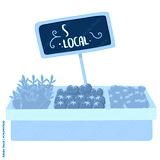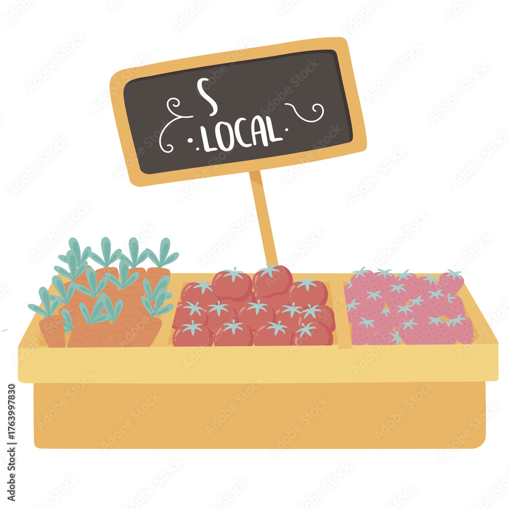 Fresh Local Produce Display Featuring Tomatoes Carrots And Berries In A Wooden Stand With A Chalkboard Sign Indicating Local Goods