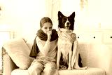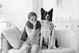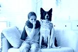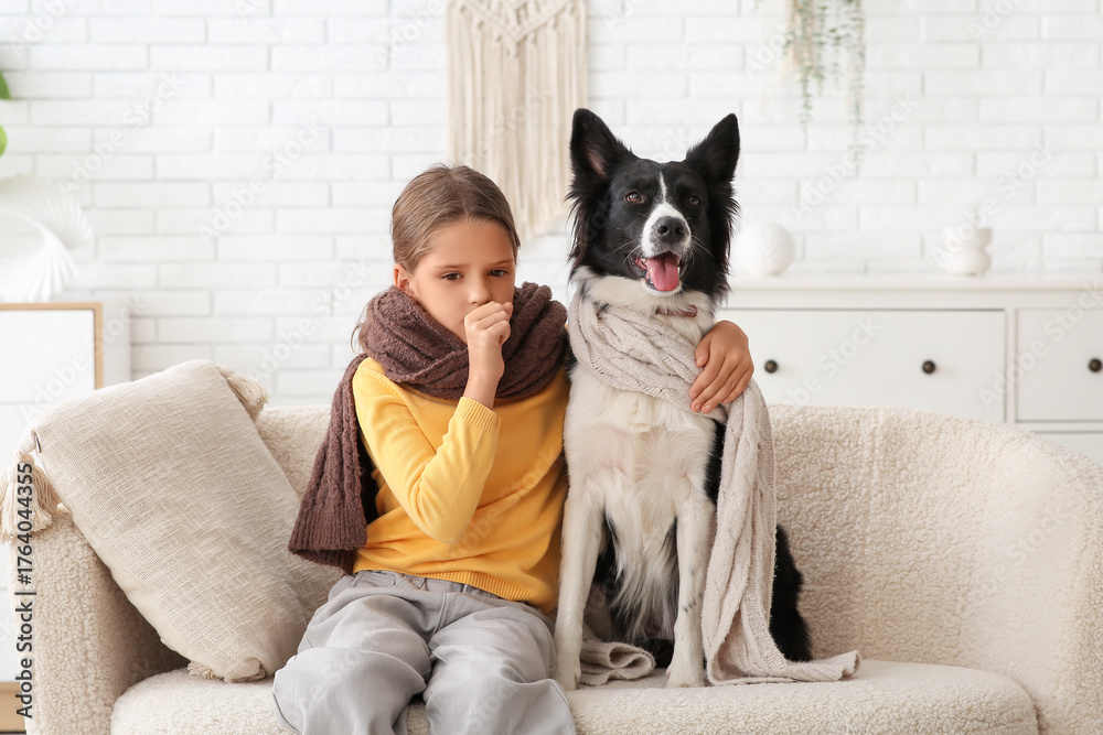 Sick little girl and Border Collie dog with scarves sitting on sofa at home