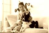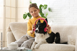 Cute little girl putting headphones on Border Collie dog at home