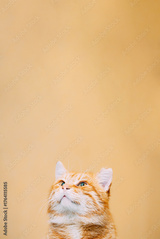 Close Up Head, Snout Of Peaceful Orange Red Ginger Tabby Cat Male Kitten Looking Up On Yellow Background. Copy Space