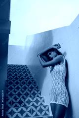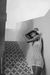 Fashion model posing on stairs in a white lace dress. Elegant resort mood with natural sunlight and tropical architecture
