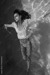 Woman floating on water in a transparent blouse under sunlight. Peaceful, dreamy and artistic summer mood