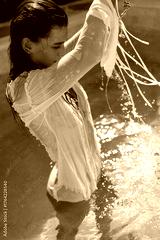 Woman playing with water drops under sunlight. Elegant resort scene with tropical tones and soft natural light