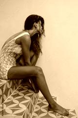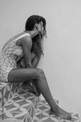 Young woman sitting on patterned stairs in a white lace outfit. Minimalist tropical villa setting with warm natural light and elegant mood