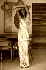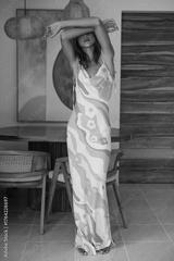 Young woman posing gracefully in a long colorful summer dress inside a tropical villa. Elegant fashion concept with natural warm tones and modern interior