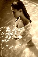 Young woman standing in clear turquoise water, wearing a white wet shirt. Elegant summer mood with sunlight reflections and calm expression