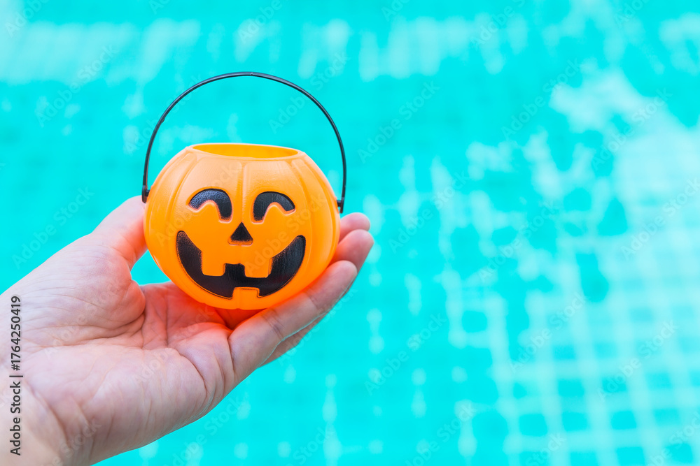 Halloween pumpkin lantern in girl hand over blurred background, happy halloween background idea, outdoor day light