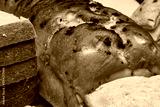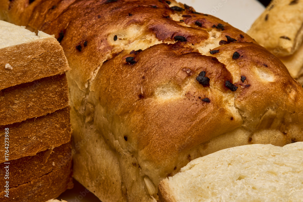 A detailed close-up image showing a freshly baked garlic bread loaf with golden-brown crust and sliced white bread beside it. The image beautifully highlights the texture, color, and crispness