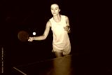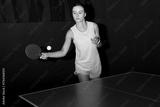 Young adult Caucasian woman playing table tennis, focusing on hitting ball with paddle, standing near table in indoor sports facility, wearing athletic clothing, hair tied back