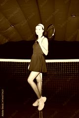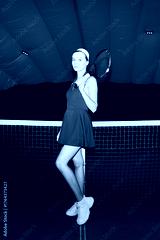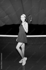 Portrait of young adult Caucasian woman standing on indoor tennis court holding tennis racket over shoulder, looking into camera with confident expression, wearing athletic attire
