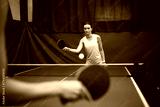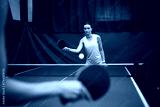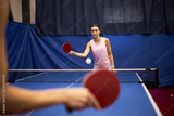 Young adult Caucasian woman playing table tennis with opponent, holding paddle and focusing on ball during match in indoor sports facility, blue curtains in background