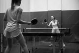 Two Caucasian teenage girls playing table tennis indoors, both holding paddles and focusing on ball, standing on opposite sides of table in sports facility with blue and red flooring