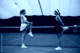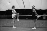 Two young Caucasian female tennis players standing on indoor clay court stretching legs before match, both wearing athletic outfits and facing each other near net