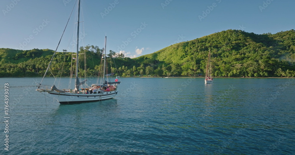 Two sailboats are mooring near a tropical island in Fiji on a sunny day, offering a tranquil and idyllic scene of ocean adventure and escape. Aerial drone flight. Amazing nature travel background