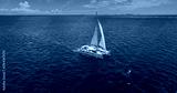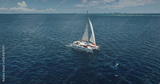 Catamaran sailing in the ocean near Kuata island, Fiji, aerial drone capturing the vastness of the sea and the beauty of the tropical islands in the background. Drone flight