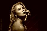 Elegant woman with wavy blonde hair, fashion red lipstick posing in flash lights against dark background. Diamonds jewelry, classic beauty, confidence and evening glamour. Hairstyle and makeup