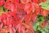 View of creeping ivy and Virginia creeper. Ivy climbing on a wall. Red leaves. Macro image, close-up. Concept of autumn colors and the coming winter.