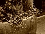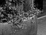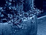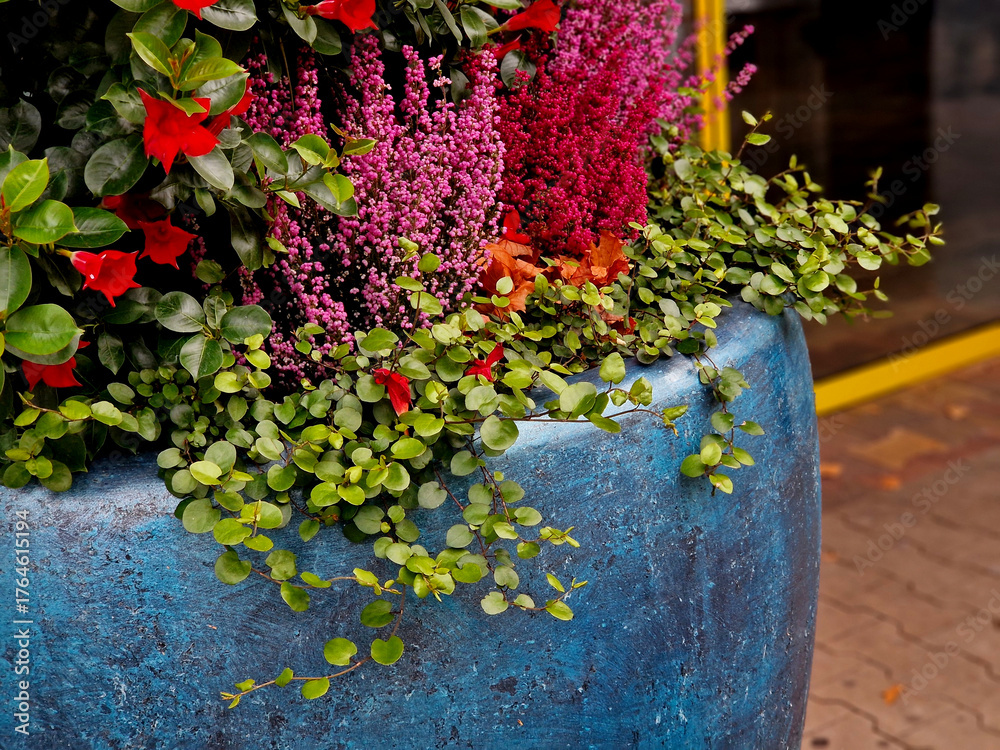 Purple and pink vibrant heathers in pastel colors in a blue glazed ceramic flower pot.
