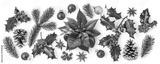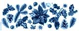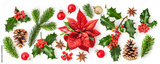 Christmas collection with poinsettia and holly. Flat lay photography isolated on white background
