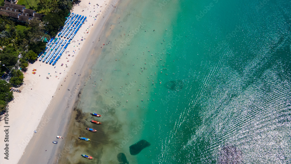 Aerial view of tropical shoreline full of tourists in turquoise sea, longtail boats anchoring in front of blue umbrella beach at Kata Beach, a famous summer destination in Phuket, Thailand.